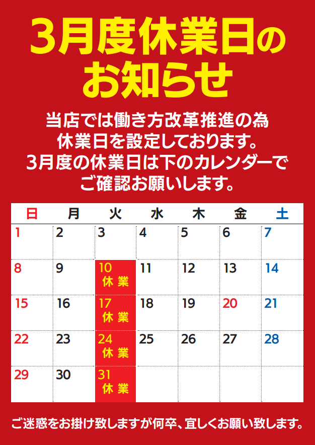 火曜日が祝日の場合は平日の営業時間で営業いたします