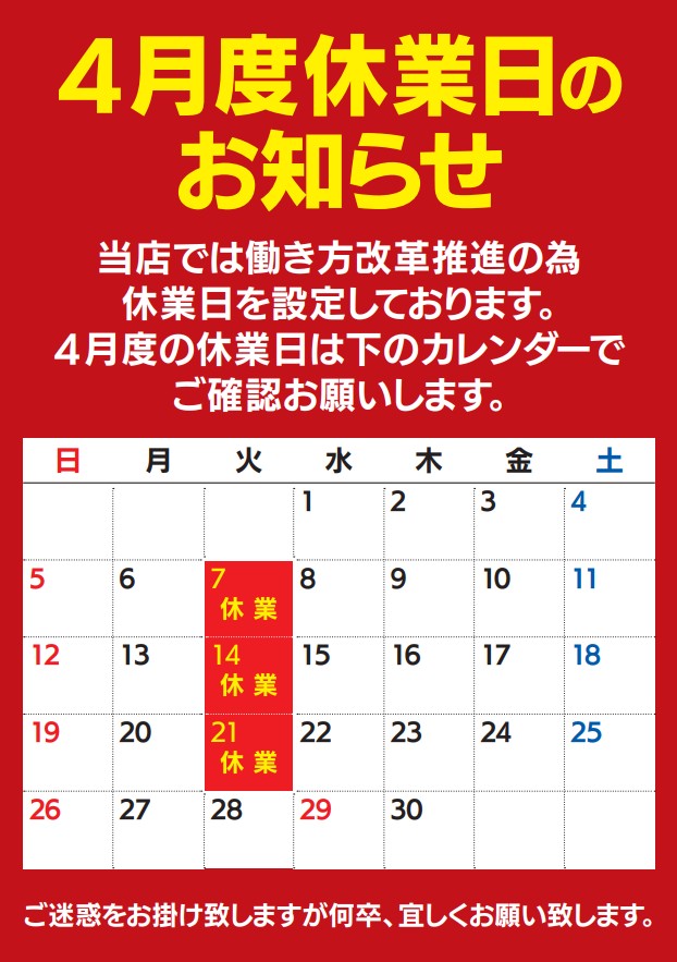 4月度休業日のお知らせ